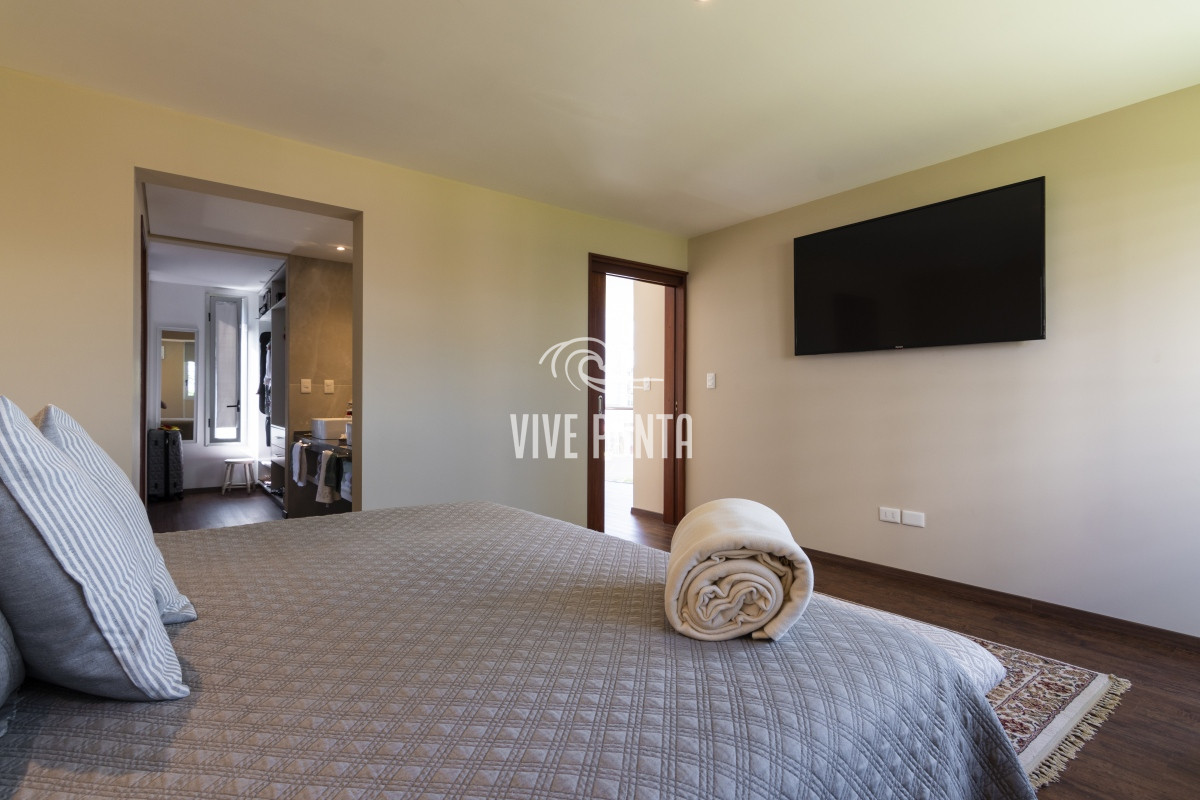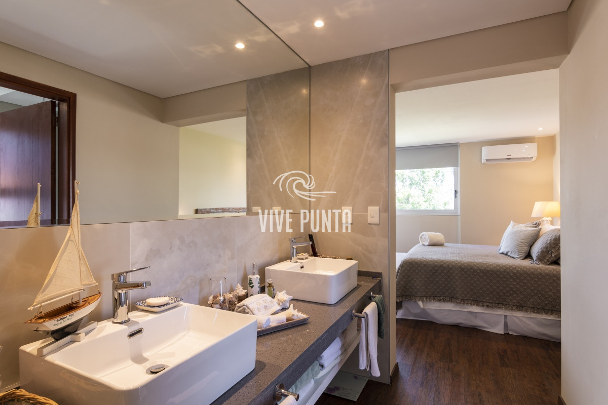 Esta casa cuenta con 2 dormitorios y 3 baños, todos en suite, ofreciendo privacidad y confort en cada rincón. La cocina de estilo americano se abre al amplio living comedor, creando un espacio perfecto para reuniones con amigos y familia.